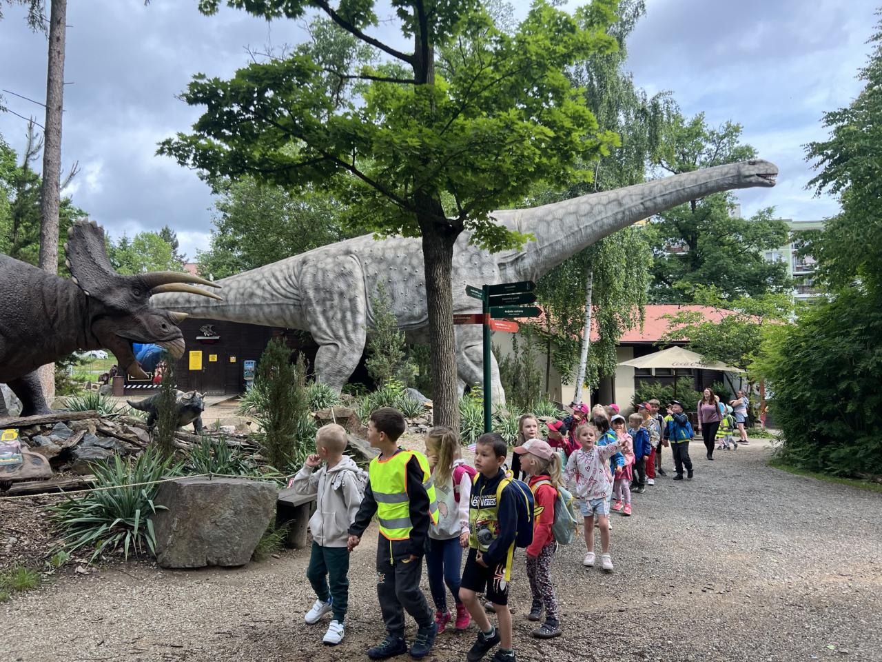 Ve školce jsme si s dětmi připomněli pravidla slušného a bezpečného chování a mohli jsme vyrazit. Pan řidič nás vysadil u Dinoparku, který jsme si prošli a kde se dětem asi nejvíce líbil robotický dinosaurus, kterého si mohly i pohladit. Potom jsme si prošli ZOO, kde děti mohly vidět vlky, velbloudy, hady, žirafy, lvy, opice a ještě spoustu dalších zvířat. Prohlídku zoologické zahrady jsme prokládali krátkými zastávkami, při kterých se děti nasvačily. Sice nám na závěr výletu pršelo a my museli nasadit pláštěnky, přesto jsme si výlet užili.